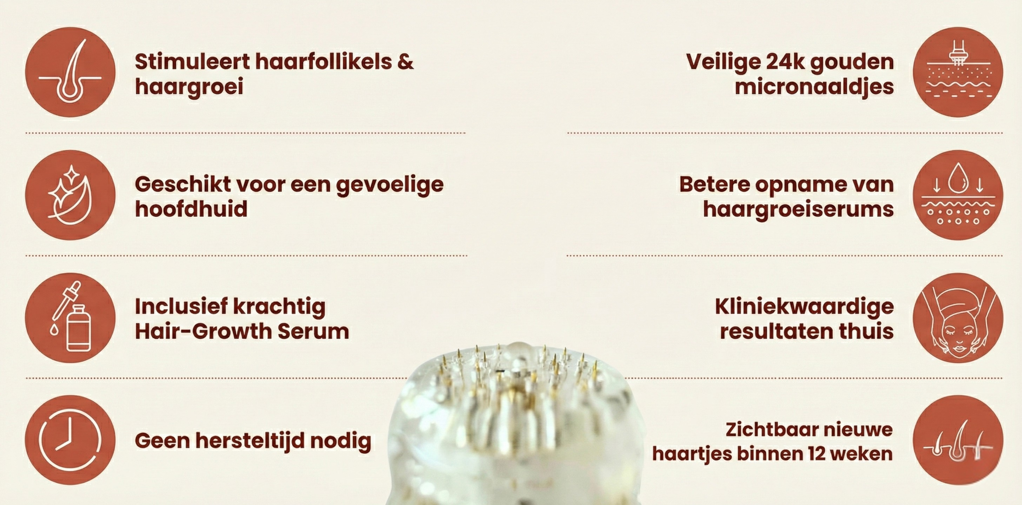 Gebaseerd op dezelfde micro-infusie methode die professionals gebruiken om haaruitval, dunner wordende plekken en zwakke haarwortels te verbeteren, maar dan betaalbaar, comfortabel en volledig thuis toepasbaar.